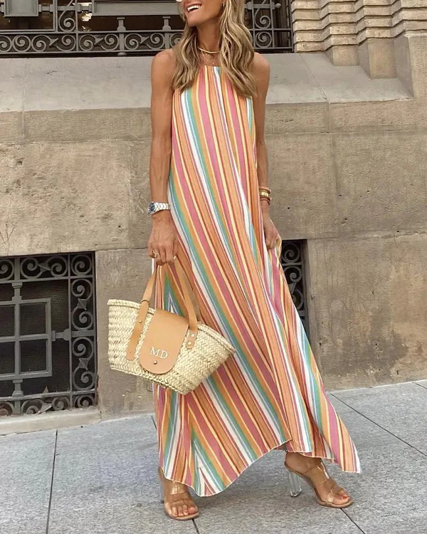 A breezy striped maxi dress inspired by sunlit days and seaside charm — effortlessly flowing with every step, it brings a touch of carefree elegance to your summer moments.