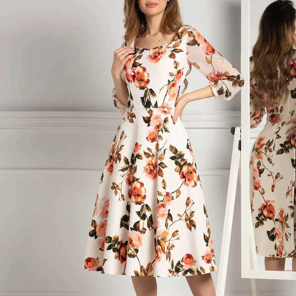 An elegant floral midi dress that captures timeless femininity — featuring soft blooms, a graceful silhouette, and a touch of vintage charm for every refined occasion.